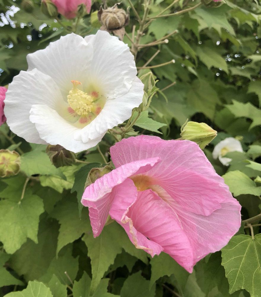 空を見上げるような大きな木。白とピンクの『フヨウ』さんがとても綺麗に咲いていました。白の方が先に----? 😊