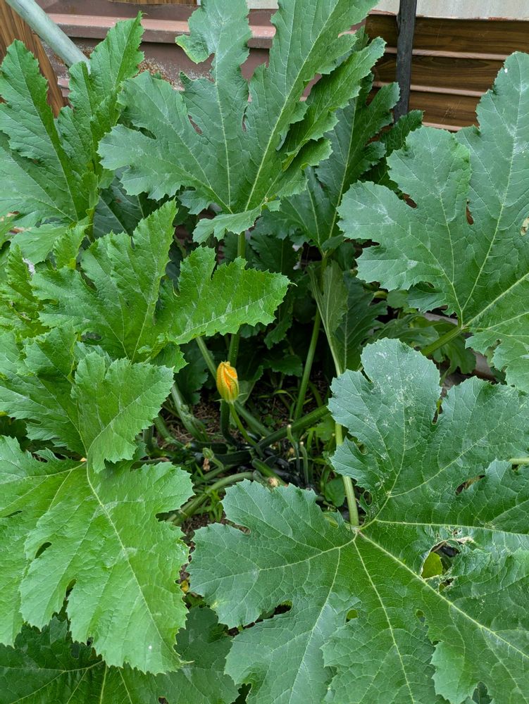 畑にズッキーニの黄色い花が咲きかけていました。ずいぶんと立派な葉っぱですね。