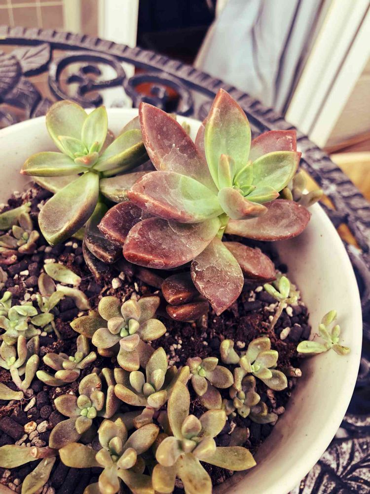 姫秀麗と名無しのグラプト属と思われる多肉ちゃん。😺こいピンクが可愛い子です。姫秀麗は一緒においている葉挿しっ子もちょっぴり芽吹いて来ました。🌱