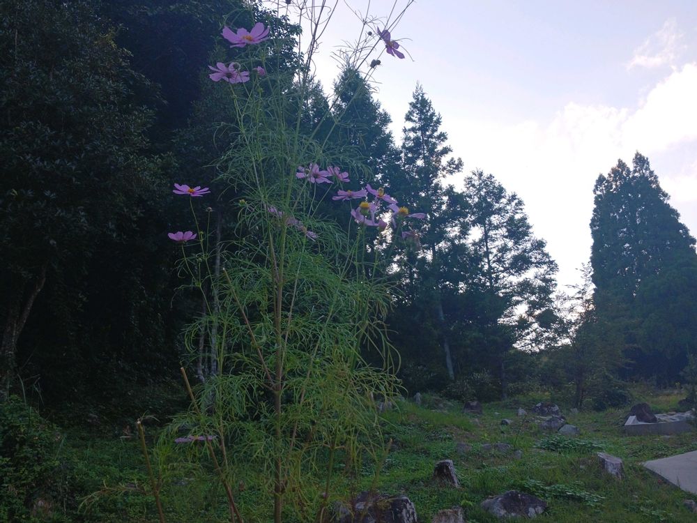 ①②ヤブランの実。③ツワブキの花が咲き始めたようです。④金木犀と山と空。⑤ひと枝から咲いたコスモスと大きい木と雲です。写りは良くないですが…