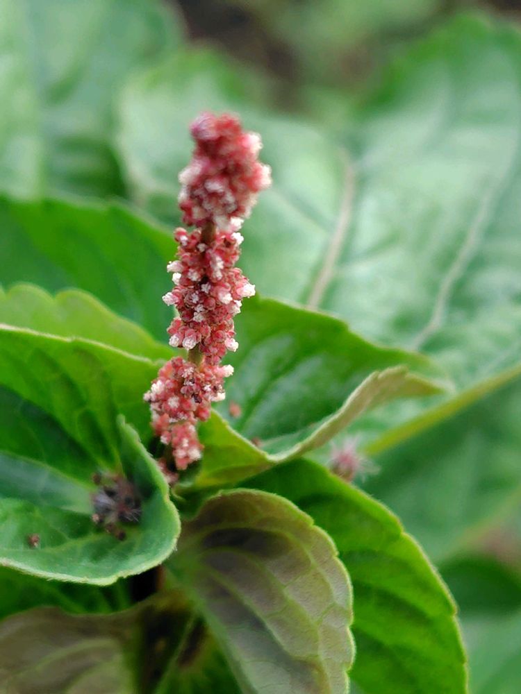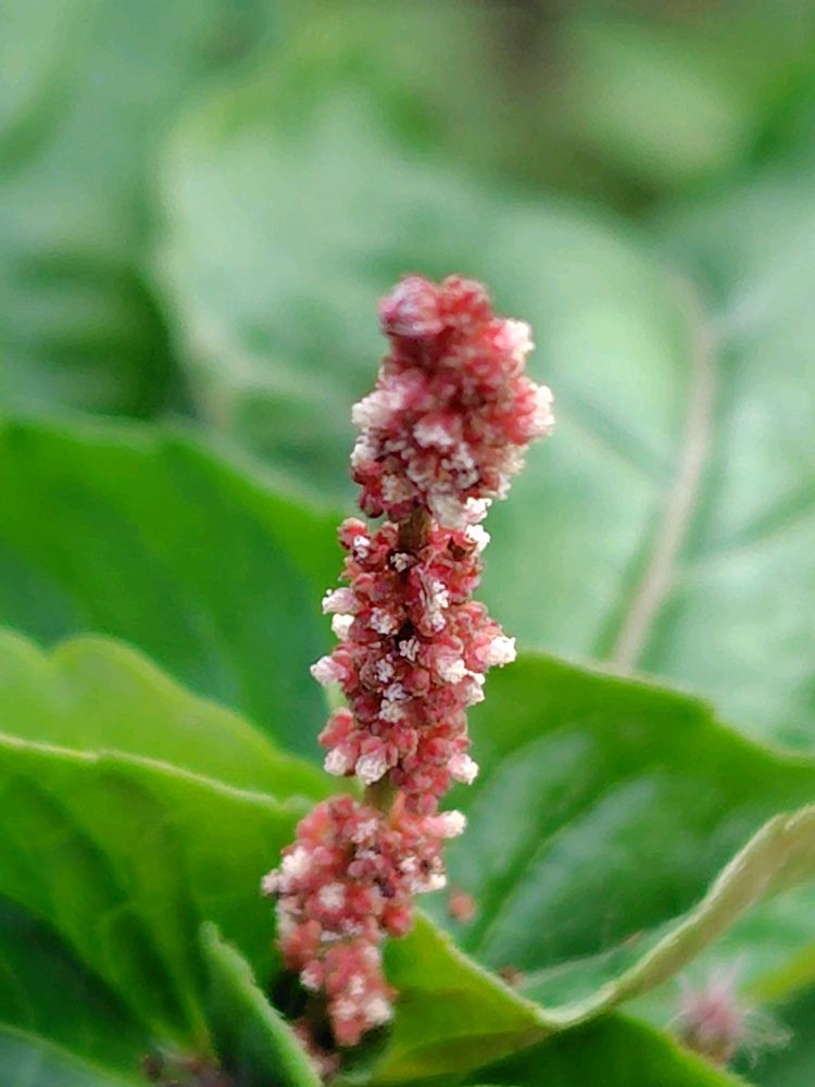 雄花の雄しべの色が淡紅色なので、花穂全体も赤っぽい色に見える。雄花は小さく、外に花被片があり、これには萼と花弁の区別がない。(①)