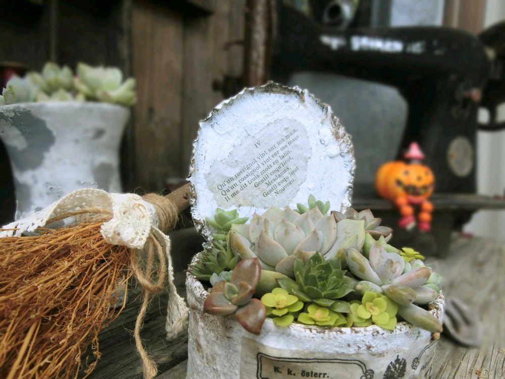 コキアのほうきは、サクラソウさんの手作りだった?多肉の寄せ植えと後ろの🎃さんと一緒に並べてハロウィンぽくてステキ🎶🧡