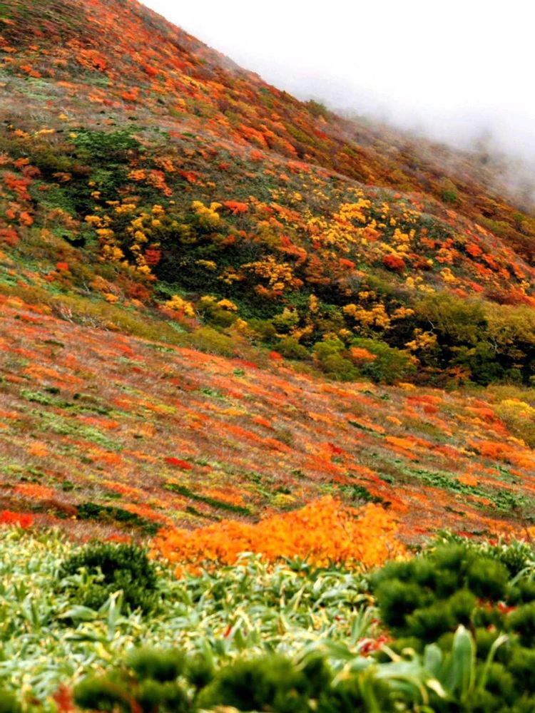 東北は、森林限界が低いので、1200mくらいでも、高い木に遮られることなく、こんな錦の絨毯に彩らるんですね🍁✨️🌿🍂🍁✨️🌿🍂ほんのか数週間で雪になるのですが……⛄️
