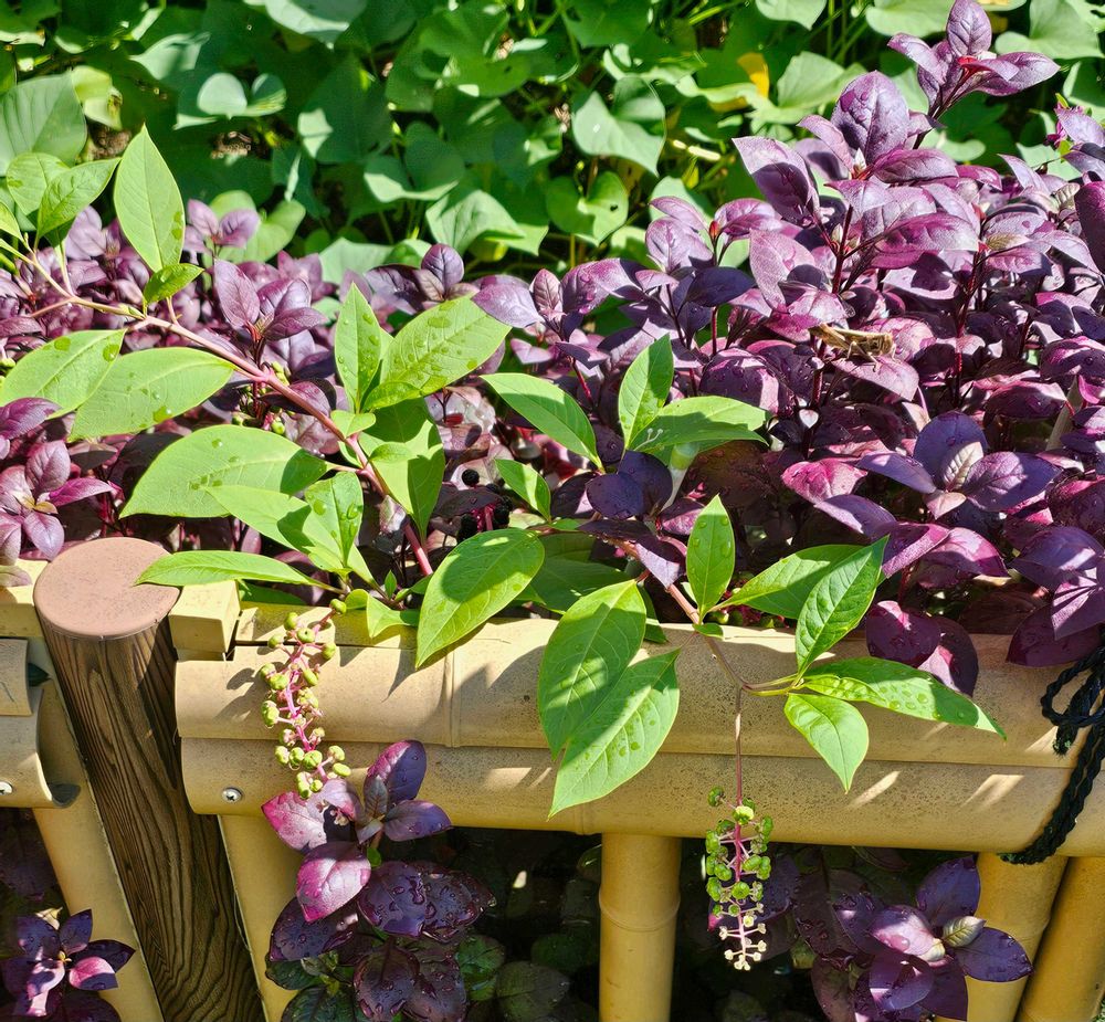 サツマイモとアルテルナンテラに挟まれた たくましいはずのヨウシュヤマゴボウは意外なくらい小さく育ったので写真に残しました今日のお花