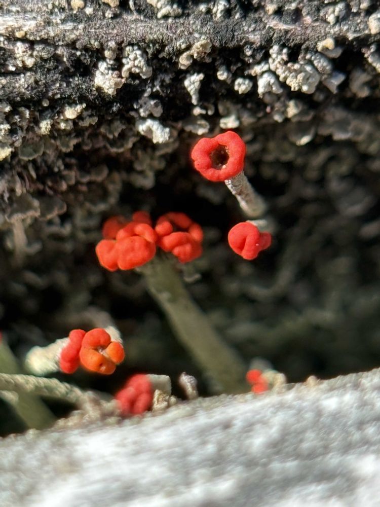 盃の先端部に赤色の子器(菌類の胞子が作られる)をつけます