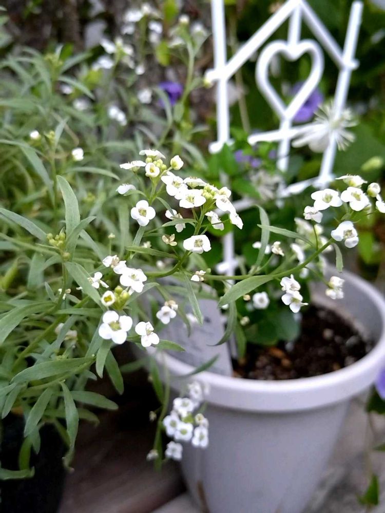 真夏の間は枯れそうな葉っぱ🌿だったアリッサムがまた咲き始めました😊🤍後ろの仙人草も頑張ってます🌱白くて小さな花は可愛らしいです😊💞