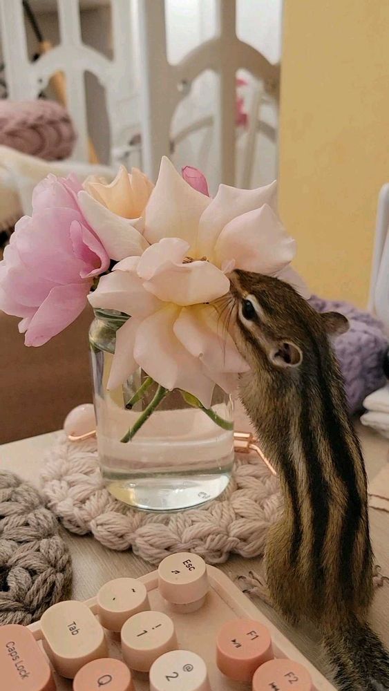 せっせとフラワーアレンジメントをする、ペットのシマリスです……(> <。)
