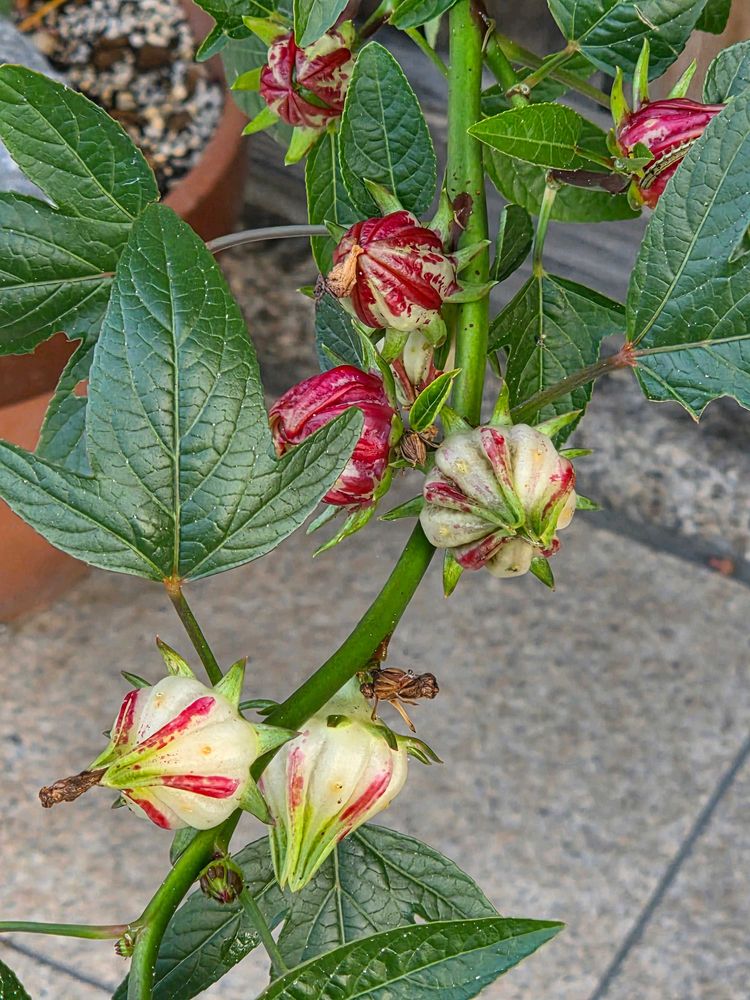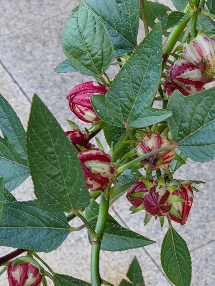 散歩道、赤白混合の可愛いローゼルに会いました。