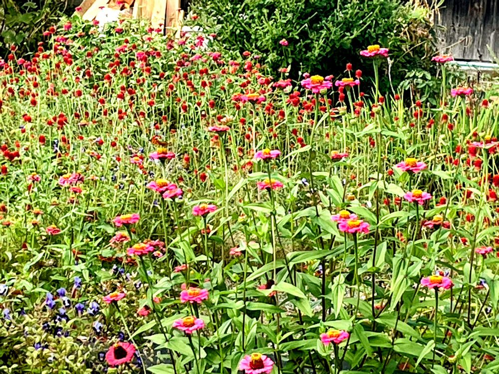 先日の1枚,ご近所さんの花畑に,赤い千日紅と百日草の投稿画像