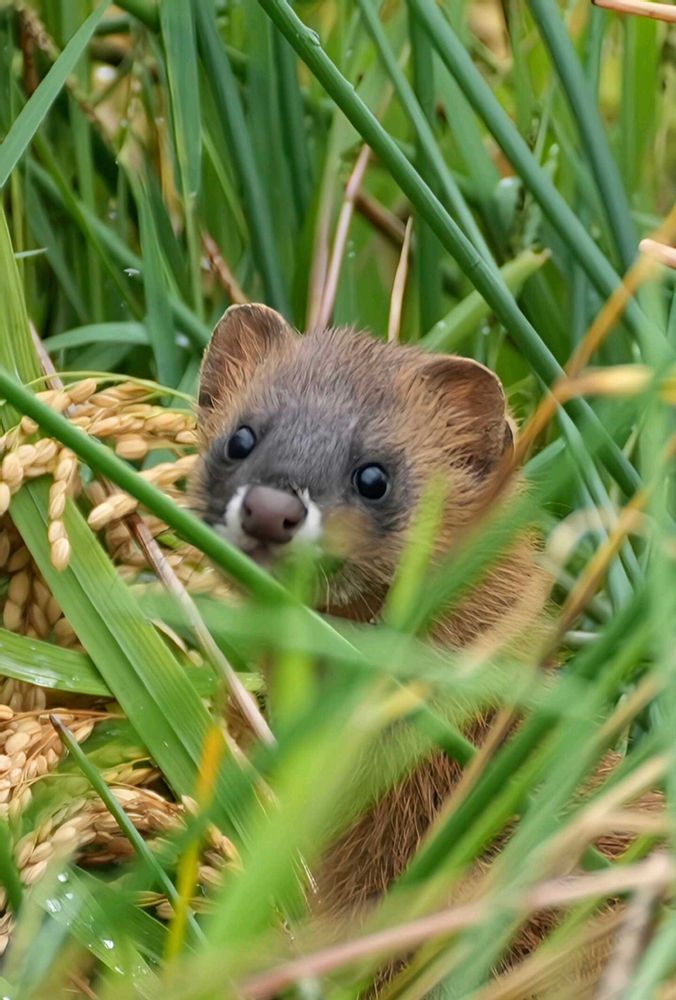 🍀刈り残された稲の巣の中から顔を出したイタチくん🍀