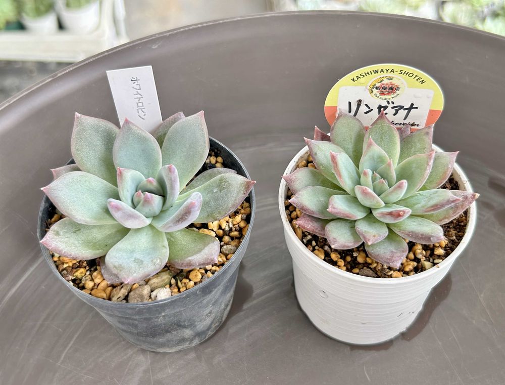 エレインさんの方は夏に高温障害で真っ白になり、日陰に入れると徒長し、可愛くなくなっておりますが、今回、入荷を待っていたフランクさんを花キさんでお迎えできたので、揃って📷✨