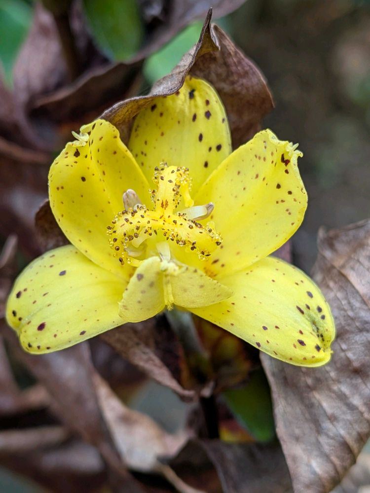 タカクマホトトギスが咲き始めました。同じ場所に置いてあるんですが今年の猛暑で葉が焼けて茶色くなってしまいました。