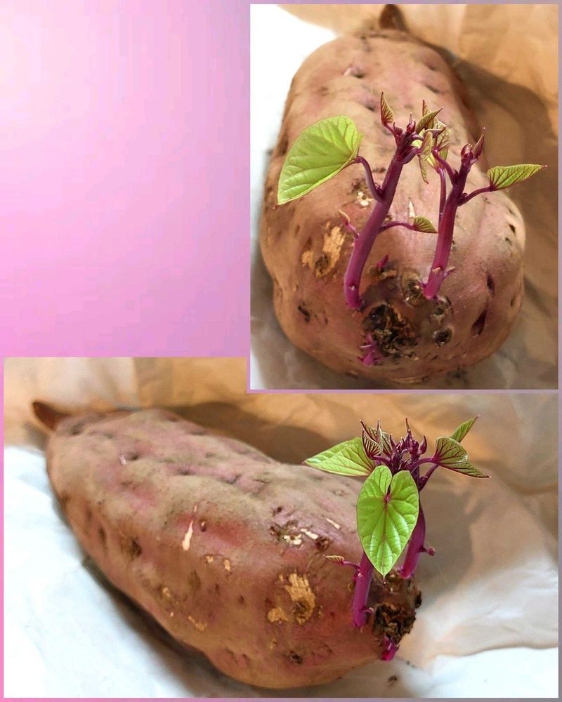 お芋の色そのままの芽と緑の葉っぱが綺麗です。我が家の父は鹿児島生まれでしたが時々からいもと言っていた記憶があります☺️
