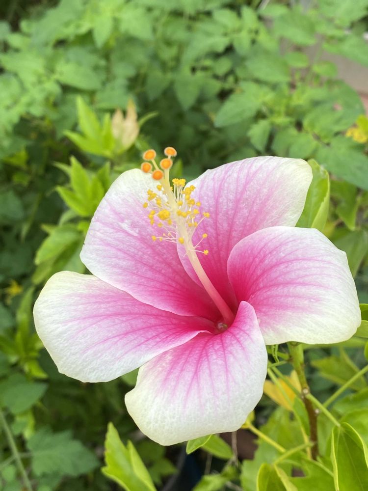 朝のウォーキングで出会ったブッソウゲ❓です。