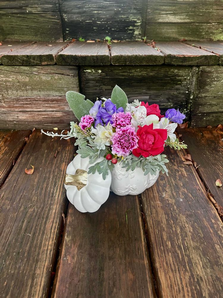 白いかぼちゃ食べたことはないですが、白い本物のカボチャをアレンジに使うことはよくあります。本物をくり抜いてアレンジを作ったりもしました。今回は陶器でできたものです👍🩷