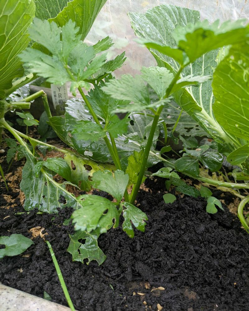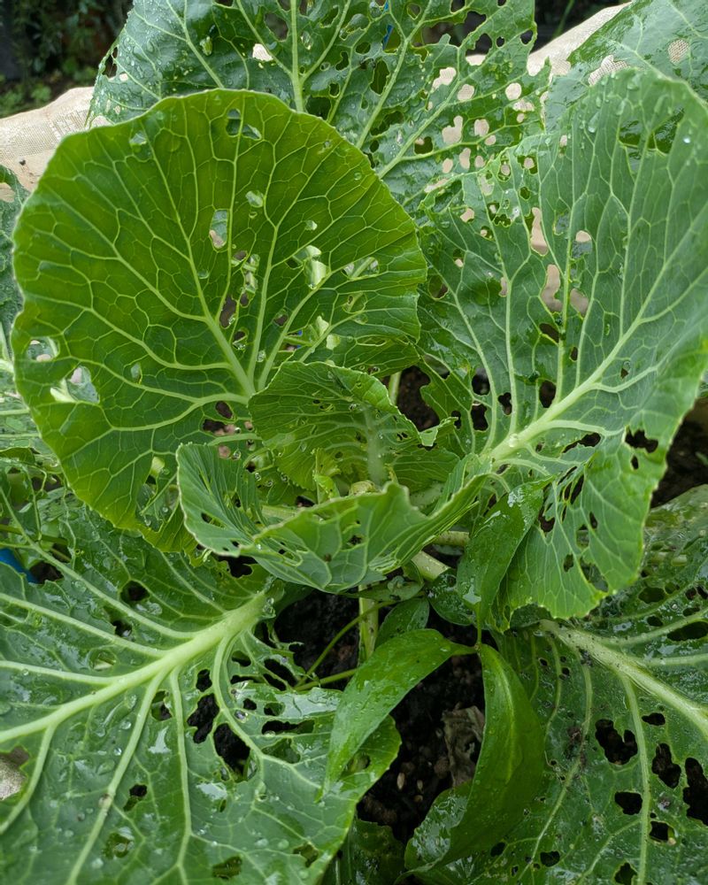 お買い得コーナーからの野菜苗、キャベツ優緑は、ネットかけてても、やること雑なのね、穴だらけなのでもう諦めました。