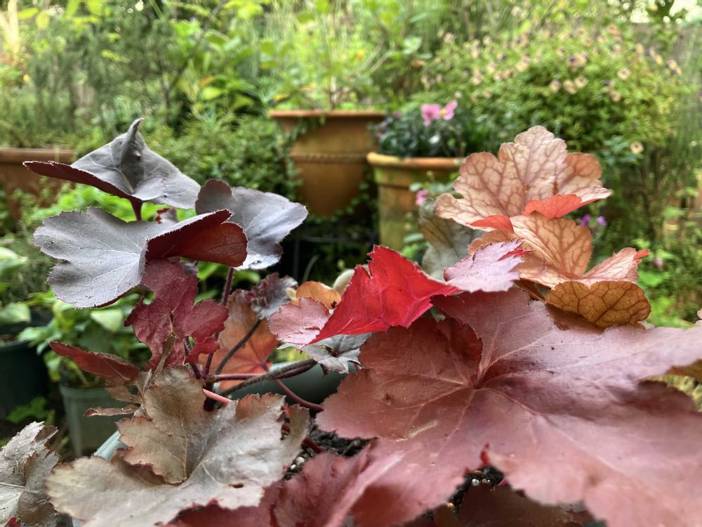 数鉢あるヒューケラの植え替えを