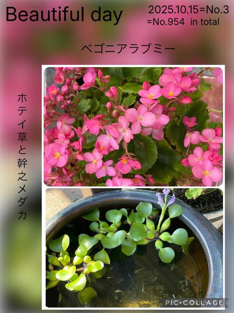『ベゴニアラブミーとホテイ草と幹之メダカ』ベゴニアラブミー:(学名:Begonia )シュウカイドウ科、短日性なので暗くなる環境じゃないと花がつきません🩷株を覆い尽くす程の沢山の花が咲きます 花言葉:”愛の告白”.ホテイアオイ(布袋葵):(学名:Eichhornia crassipes ).(別名:ウォーターヒヤシンス)ミズアオイ科.葉柄が丸く膨らんで浮き袋の役目をしている💚花は青紫の六弁花で花芯は黄色💜幹之メダカ:ブルーみを帯びた爽やかなツヤが美しく背中の光沢が特徴の改良メダカさんです🍀