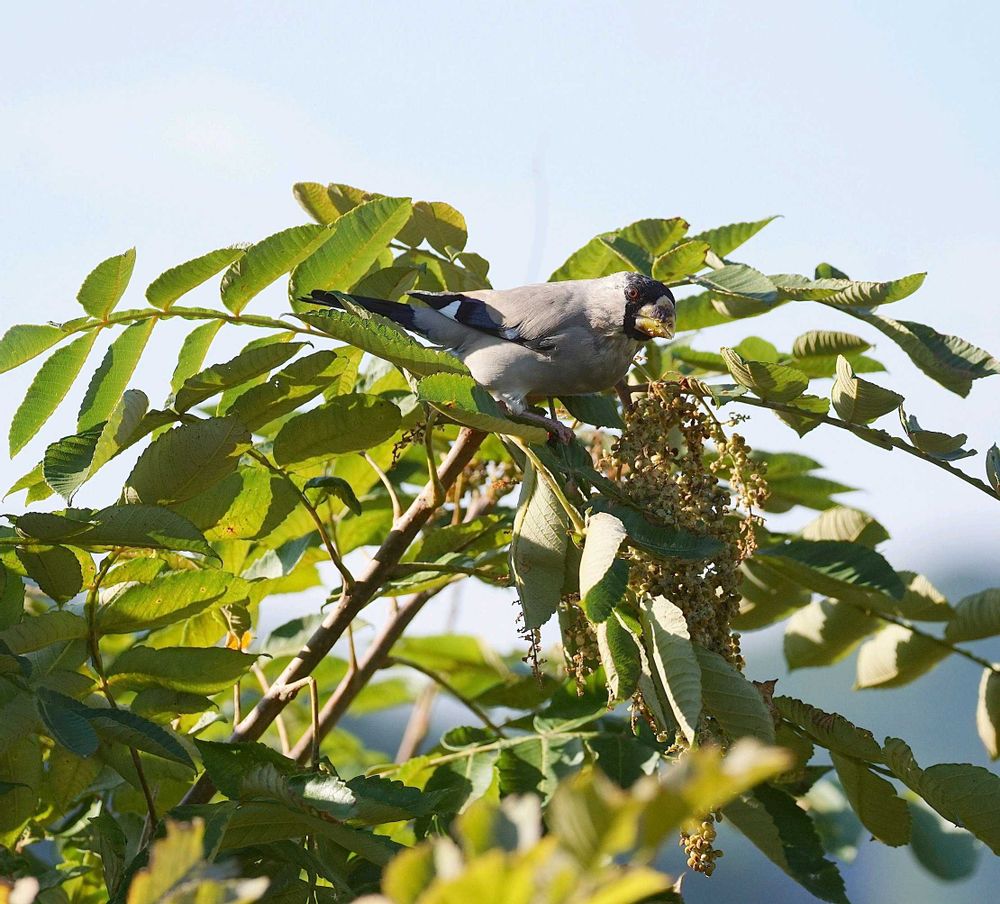 ヌルデの実がよっぽど美味しいのでしょうか😋イカルさん くちばしだけじゃなく顔までお弁当付けて🤣素晴らしい写真が撮れていますね✌🏻超レアな角度でパチリ😍