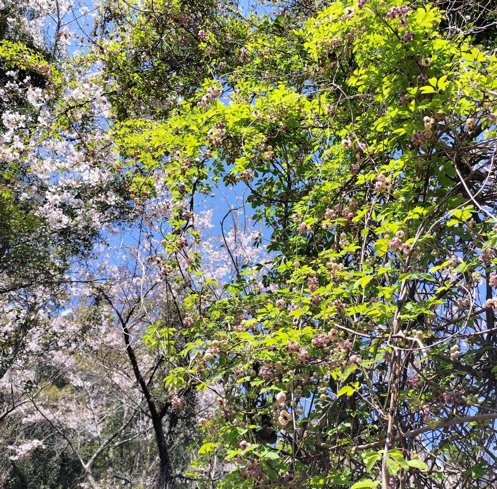 大きな桜の木に絡んだアケビ今頃行ったら実ができているのかな?