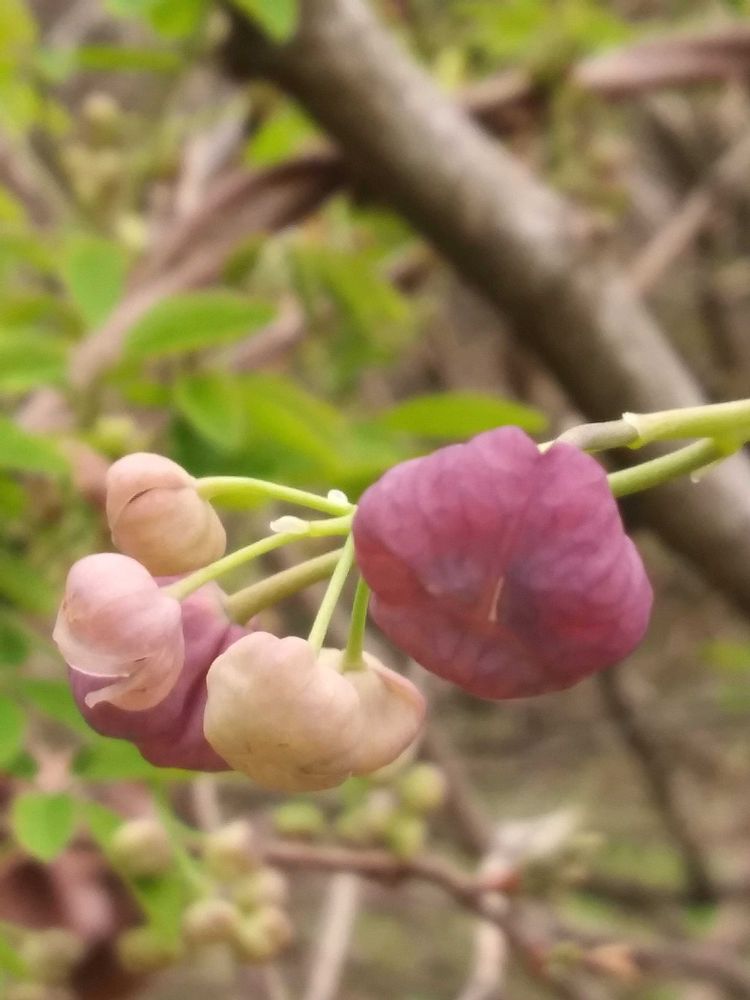 花弁のように見えるのは萼片(がくへん)と呼ばれるもので、ミツバアケビの花はより濃い紫色をしています。