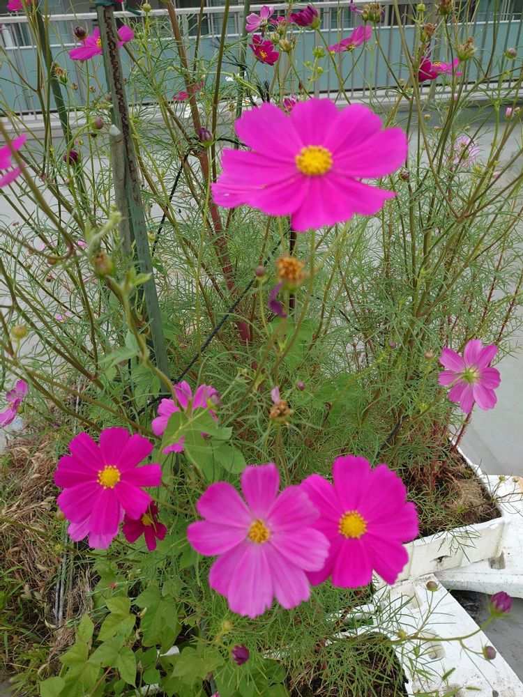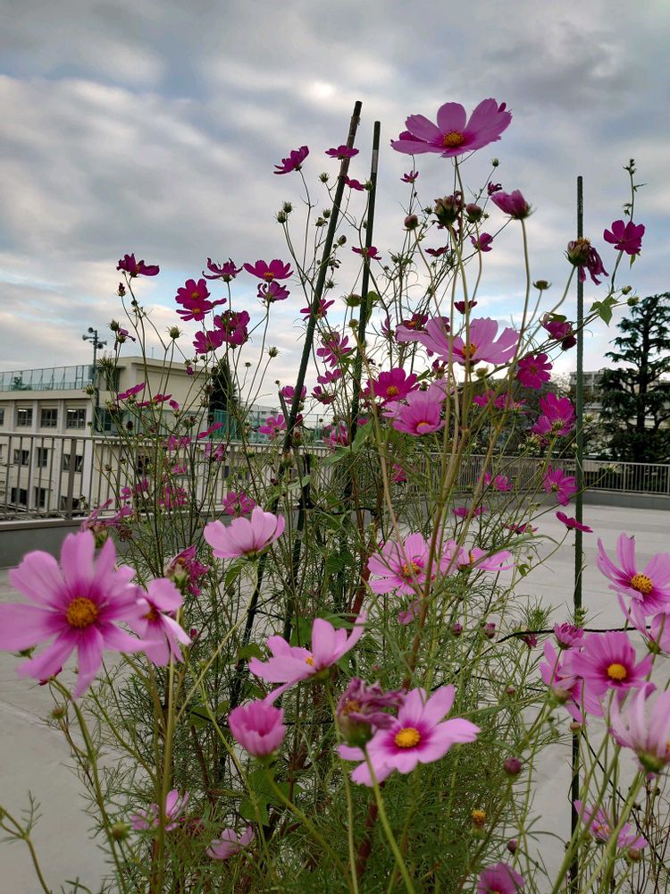 5️⃣コスモス🌸🌸🌸越しの屋上の景色☁☁☁曇り空😌