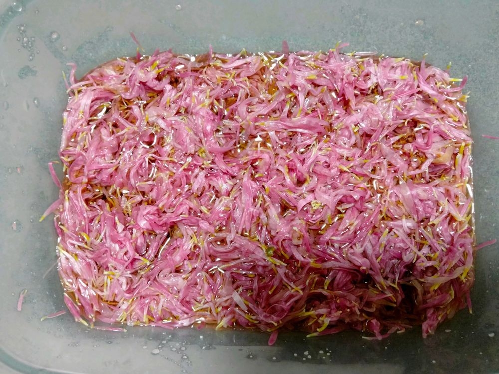 茹でた後、叔母に聞いたら水で晒してバラバラしてから絞った方が良かったみたいです。そのまま絞ったので花弁が団子状態で絡まっちゃったのかな😅