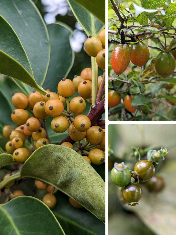 ⬅️冬は鮮やかな赤になるクロガネモチの実だけど、今は、こういう色