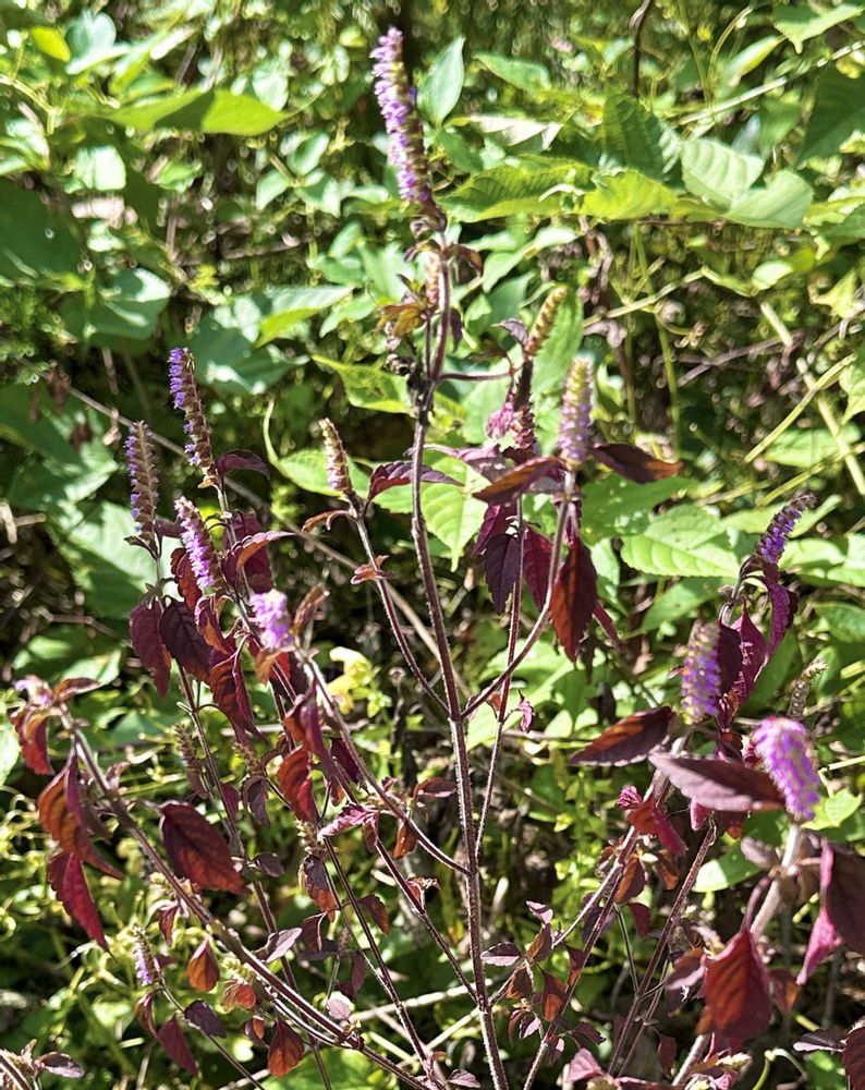 ナギナタコウジュがたくさん生えだしています。その中に1本だけ、濃い色に紅葉してるのがありました🍁😍