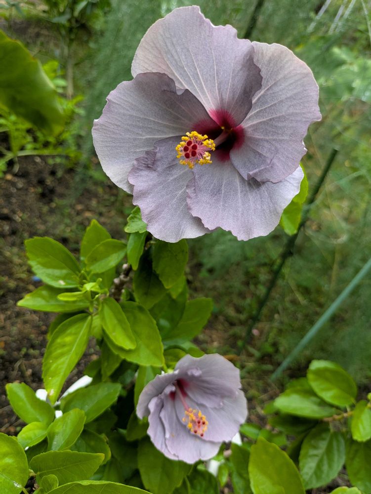 ハイビスカス デニムブルーと、ケイトが2輪ずつ咲きました。小さな木だから、中々2輪は咲きません。