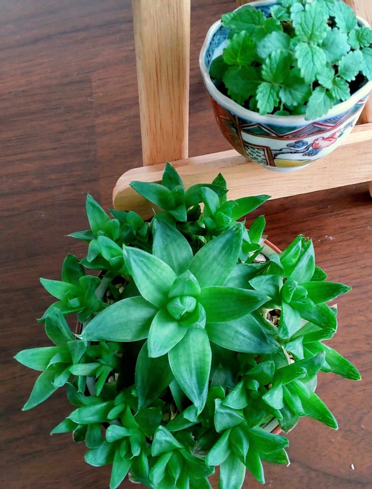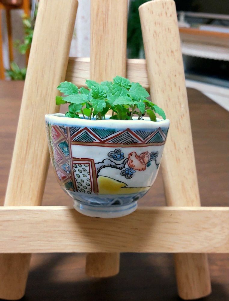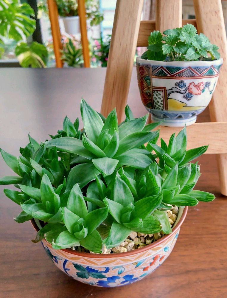 手前のハオルチアがモリモリと成長中 百円で買ったのが何倍にも😍奥の古伊万里のお猪口では謎のハーブを育成中(ヤバい物ではない)古伊万里の手書きの鳥が可愛い
