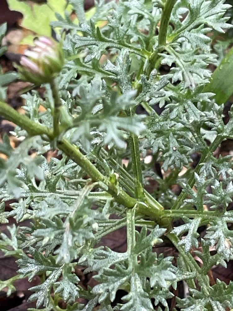 東北から九州に分布するキクの仲間で、葉には切れ込みがあり、秋に白い花を咲かせます。地域によって個体差があるようで、本種は、葉がとても細かく切れ込み、草丈が高くならないタイプ。(12㎝)