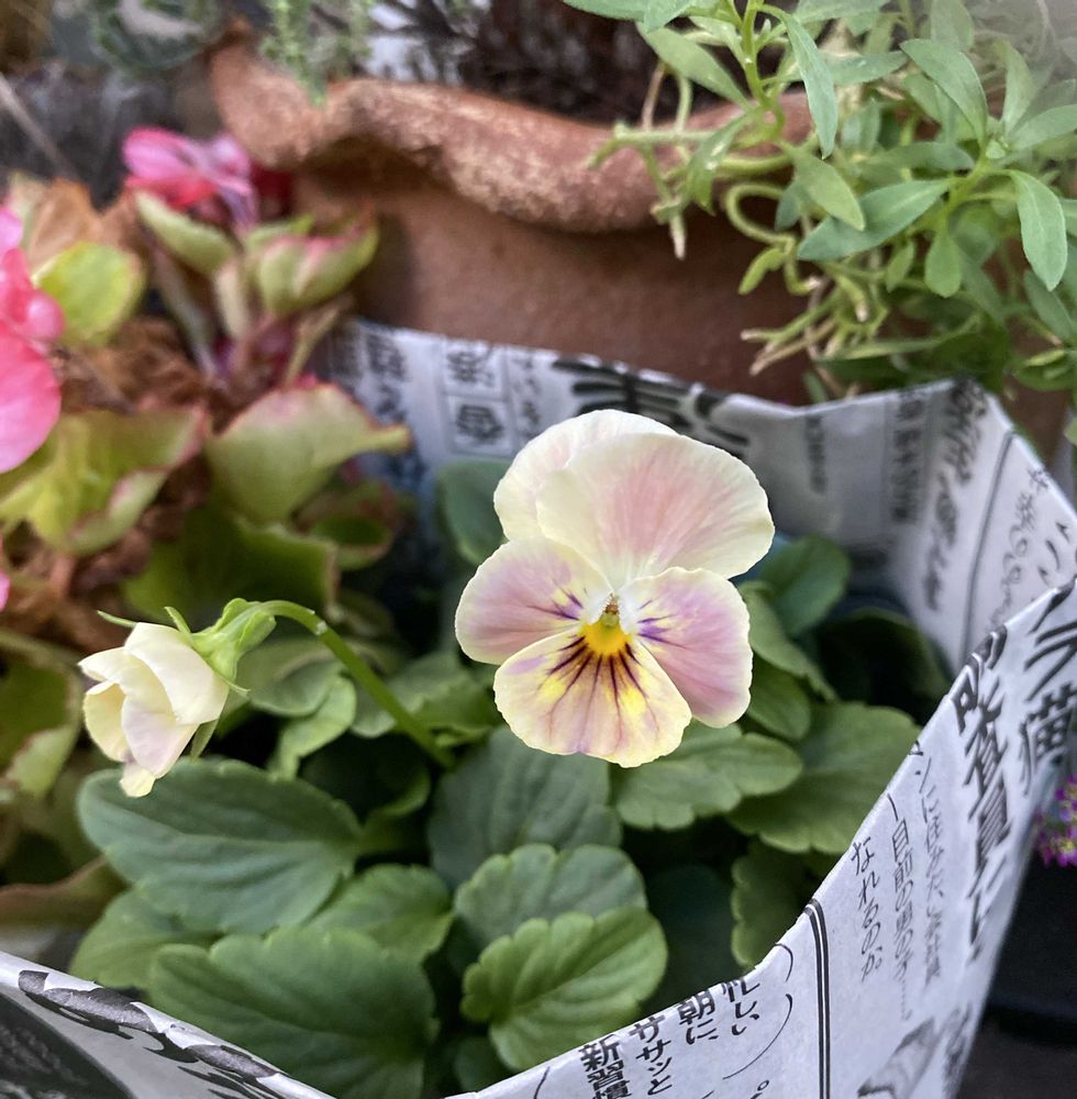気を取り直してとなりの市の園芸店へ まん丸顔の華あられさんお迎えしました サービスで終わりかけのお花を1つ頂きましたෆ.*・゚