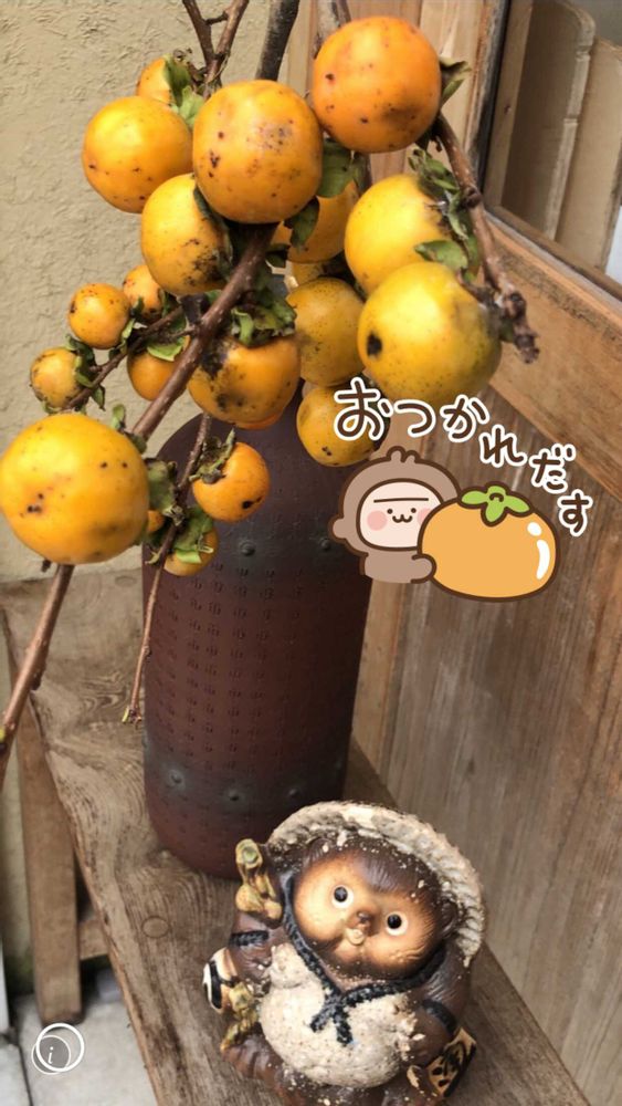 不揃いの柿が素朴で、タヌキの置物とよく合いますね‼️🦉🍶