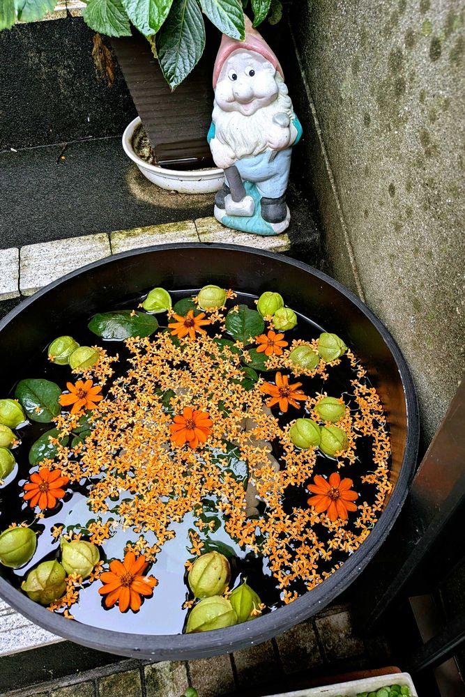 金木犀の散った花手水、かわいいね🧡🧡🧡🧡🧡💓