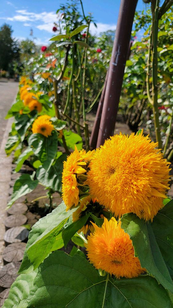 花壇の歩道横に可愛いひまわり🌻が沢山咲いてました😊