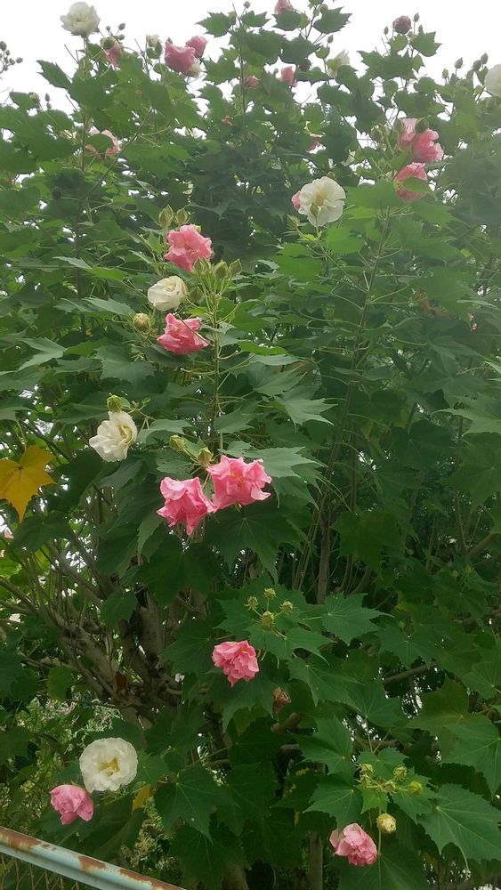 今頃フヨウ(❌酔芙蓉)が満開になっています。白とピンク二色咲きでとても可愛い。