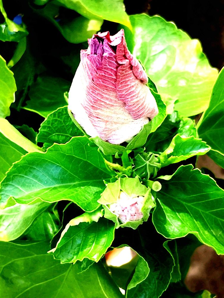 この赤い蕾からあの渋いブルーのハイビスカスが咲くのですね!不思議です😊