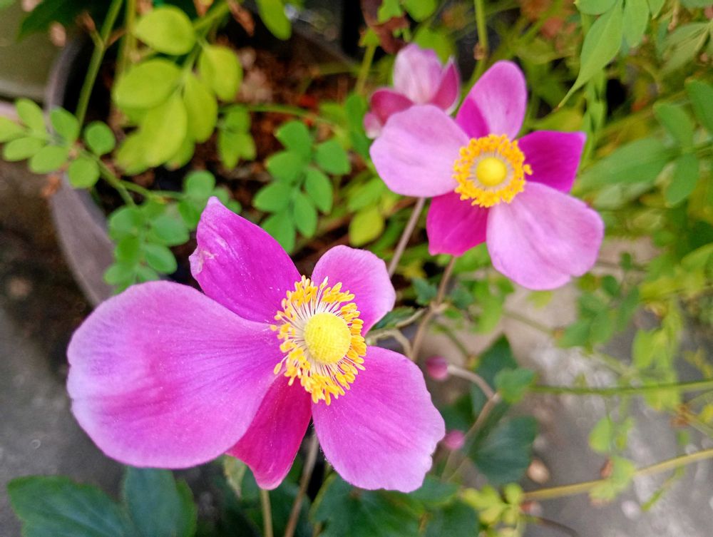 先日🍀花友さんから頂いたばかりの秋明菊「ダイアナ」もポットのまま😅開花🩷❤️💮(週末に冬にむけた作業予定、まとめて…植え付けも予定👌)