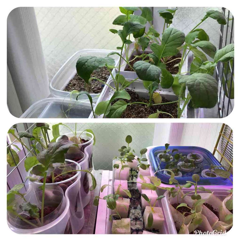 昨夜、葉の重さで隣同士押し合い折れている為個別に入れ替えてた。100均のカップケースとクリアカップ、ペットボトル、ハイドロボール。