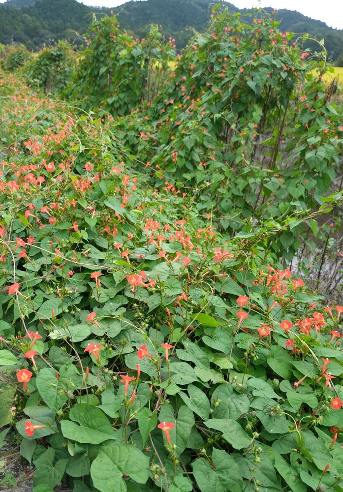 ヒルガオ科サツマイモ属の一年草。江戸時代末期の嘉永年間(1848〜55年)に観賞用で日本に入った熱帯アメリカ原産の帰化植物。大気汚染に弱いアサガオにとって代わる勢いがある。主に中部地方以西に帰化している。都市周辺の空地、人里近くの草地や河原に生える。葉は互生し、卵形で先は尖り、基部は心形。花期は8~10月。花は朱赤色で中心部は黄色。花冠は直径1.5〜2㎝で、上から見ると五角形。果実は丸い。