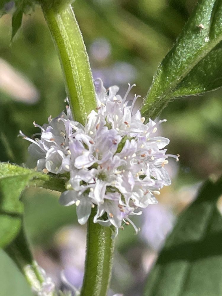 茎の上部、葉脇に紫白色~紫色の小さな唇形花を密に輪生します。草全体、特に花と葉で爽やかな香りを放ちます。