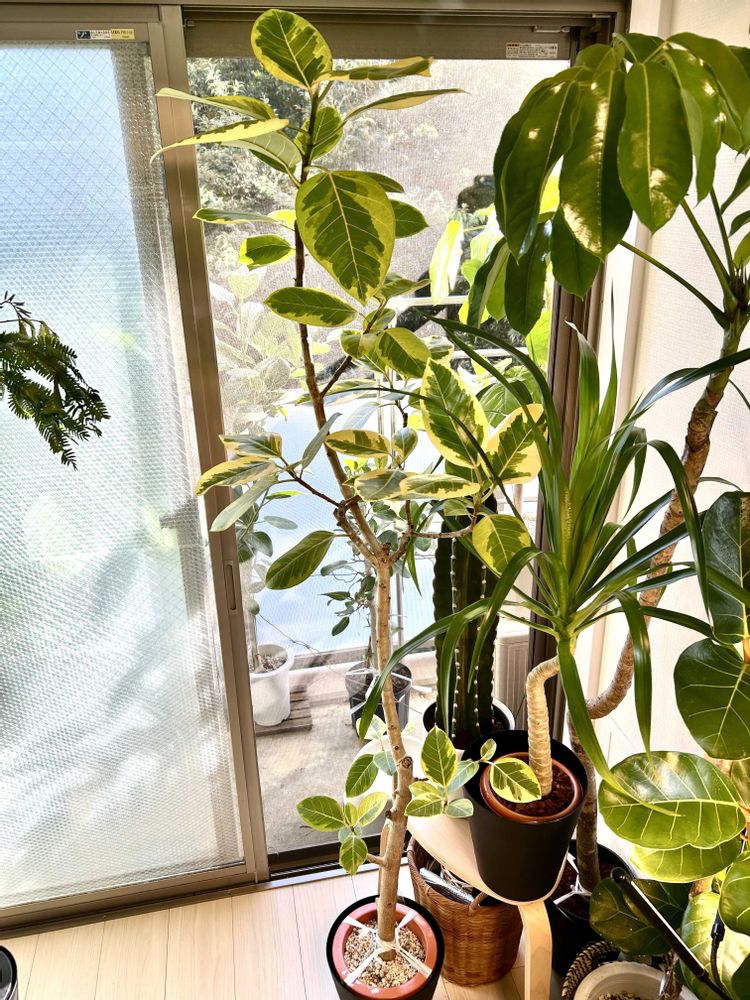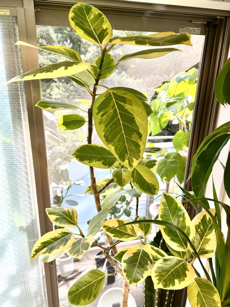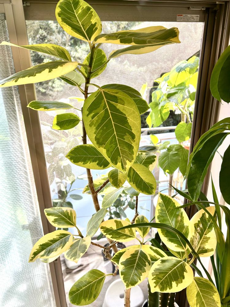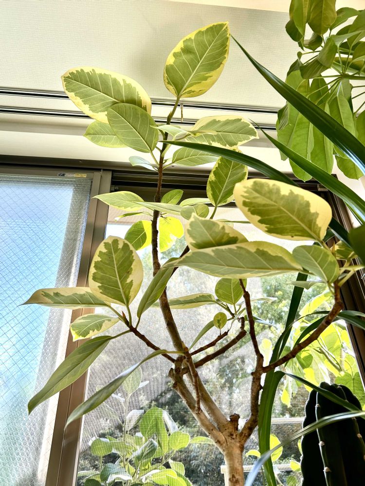 お気に入り😃ずっとベランダに出してたフィカスアルテシマを久しぶりに部屋に入れた😊斑入りの葉っぱ☘️がかわいい🩷です〜😊オマケ