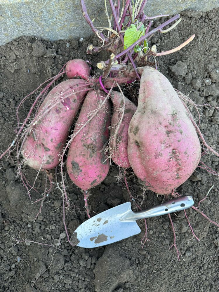 ①左の大きいのが1株からのシルクスイート、右の小さめが5株からの安納芋