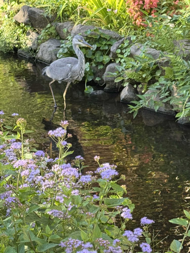 (アゲラタム)の咲く水辺をのっそりのっそり歩いている、サギさんに出会えました✨🕊️💜🎶