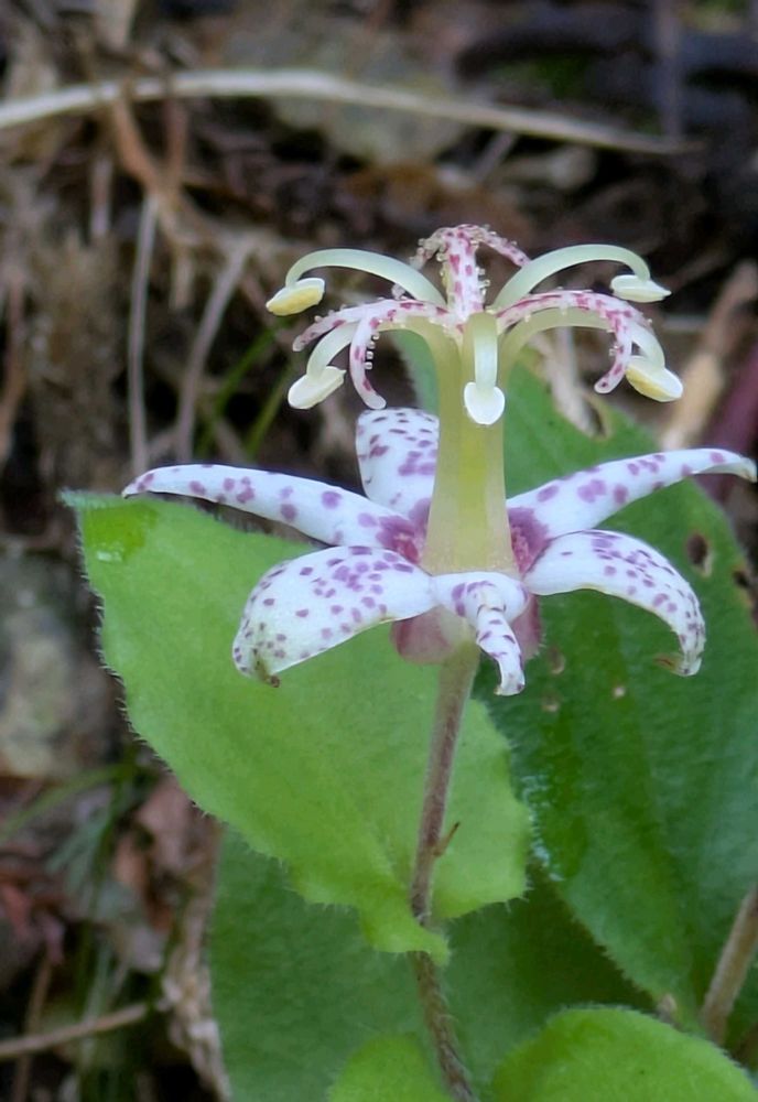 山寺の脇道にヤマジノホトトギス♪ 名前の似ているヤマホトトギスと違って花糸は真っ白で、花弁は反り返っておりません♬