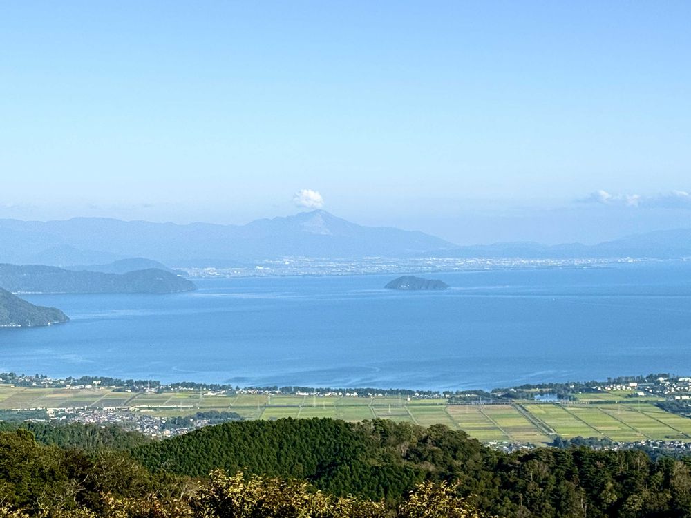 遠くに山の上から噴火のような雲🌋がある山は、びわ湖の向こう側の伊吹山,標高1,377m 、ひょっこりひょうたん島🏝️の様なのはびわ湖の中の竹生島…