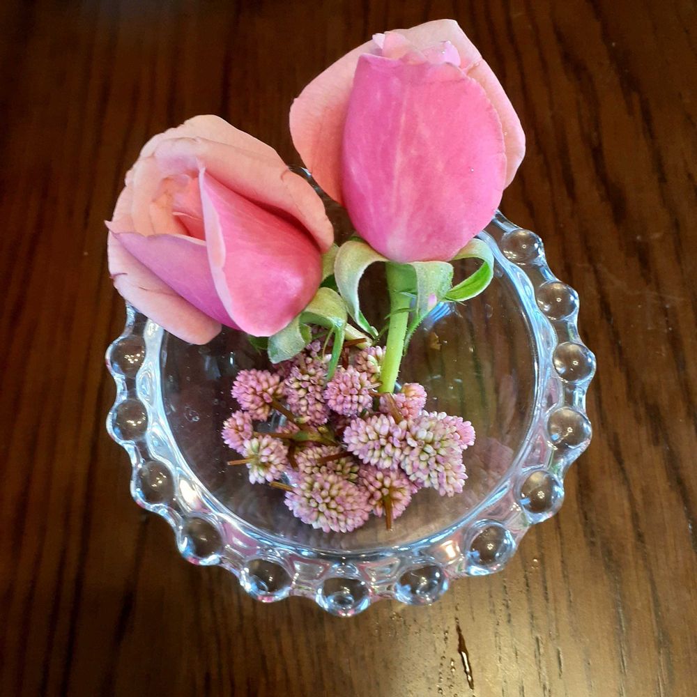 可愛い❤生花でしょうか?お庭で、咲いたお花でアレジメント?色合いが、良いですね。朝から癒されました💕😆💕✨