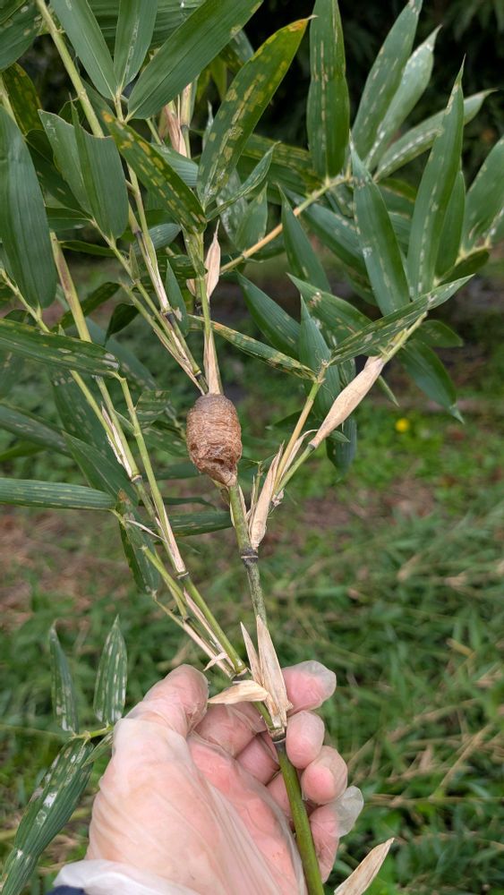 支柱に使う竹を切り出し枝を払っていたら、カマキリの卵を見つけました