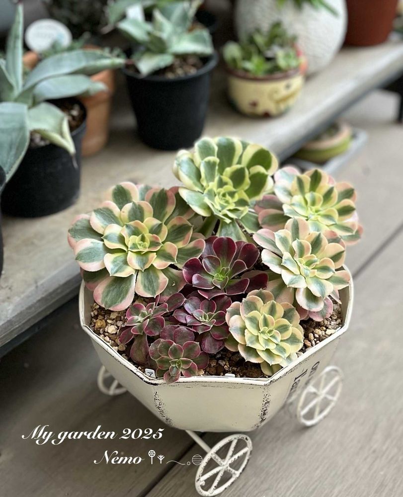 頂き物の鉢へアエオニウムさん纏めて見ました、色が似てると名札が無いと分からないね〜これから可愛いく色付いてね💕